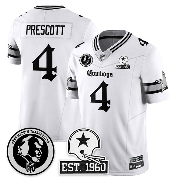 Men Dallas Cowboys 4 Dak Prescott White 2025 F U S E With John Madden Patch 26 Established In 1960 Patch Vapor Limited Stitched Football Jersey