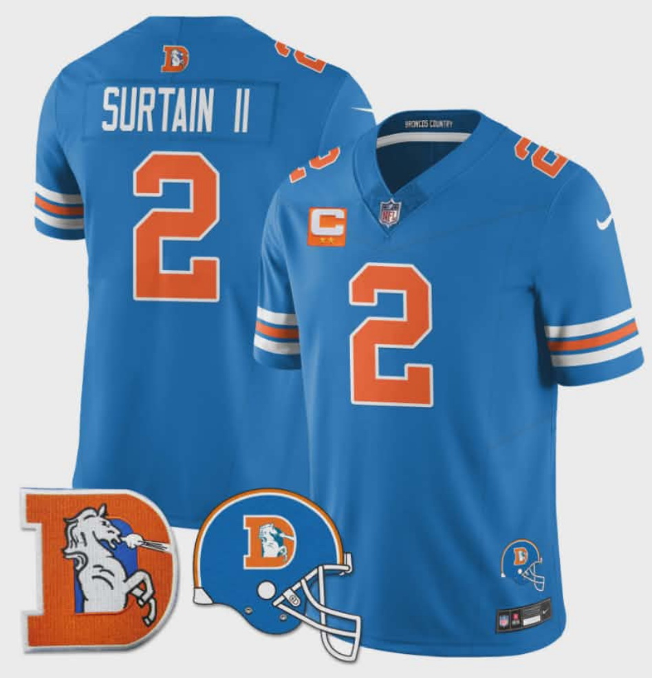 Men Denver Broncos Throwback 3 Times Champions Patch Vapor Limited All Stitched Blue #2 Patrick Surtain II Jersey
