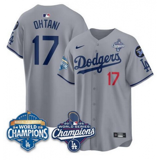 Men Los Angeles Dodgers 17 Shohei Ohtani Grey 2025 World Series Champions 26 Back to Back Champions With No 34 Patch Limited Stitched Baseball Jersey