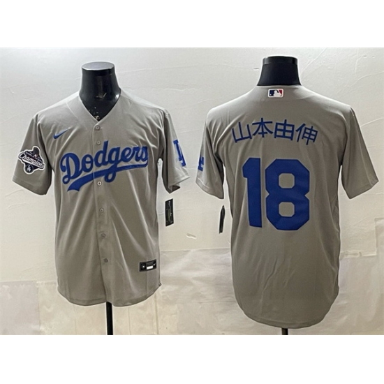 Home>MLB>Los Angeles Dodgers>Men>Men Los Angeles Dodgers 18 Yoshinobu Yamamoto Grey 2025 World Series Champions Patch Cool Base Stitched Baseball Jersey
