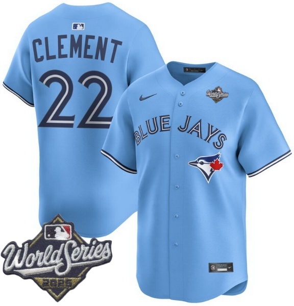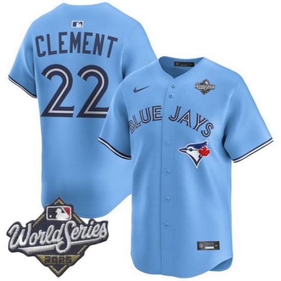 Home>MLB>2025 World Series>Toronto Blue Jays>Men Toronto Blue Jays 22 Ernie Clement Light Blue Cool Base Stitched Baseball Jersey