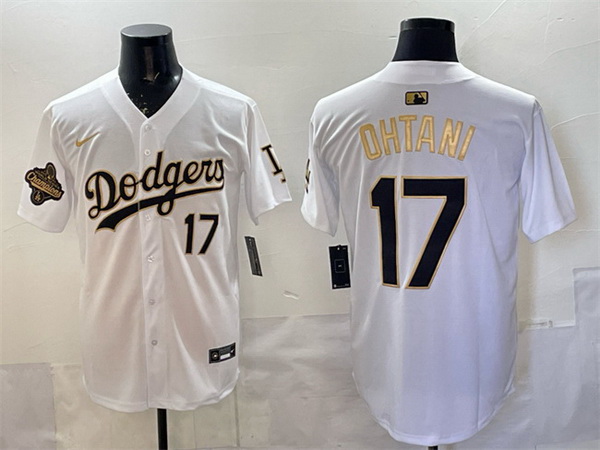 Men Los Angeles Dodgers 17 Shohei Ohtani White Gold 2025 World Series Champions Patch Limited Stitched Baseball Jersey
