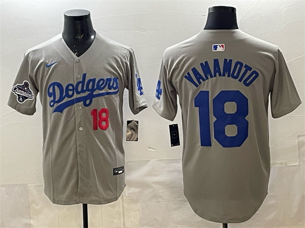 Home>MLB>Los Angeles Dodgers>Men>Men Los Angeles Dodgers 18 Yoshinobu Yamamoto Grey 2025 World Series Champions Patch Limited Stitched Baseball Jersey