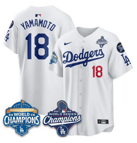 Men Los Angeles Dodgers 18 Yoshinobu Yamamoto White 2025 World Series Champions 26 Back to Back Champions With No 34 Patch Limited Stitched Baseball Jerse