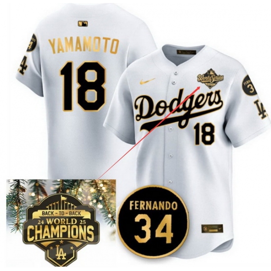 Home>MLB>Los Angeles Dodgers>Men>Men Los Angeles Dodgers 18 Yoshinobu Yamamoto White Gold Rbackto back championship Patch With No 34 Patch Limited Stitched Baseball Jersey