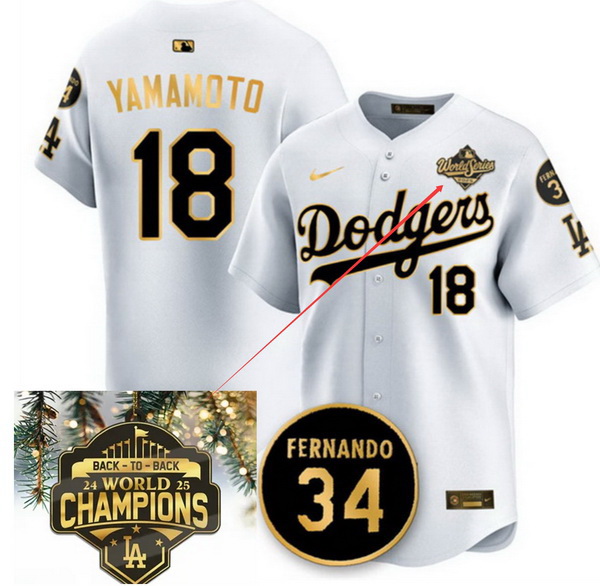 Men Los Angeles Dodgers 18 Yoshinobu Yamamoto White Gold Rbackto back championship Patch With No 34 Patch Limited Stitched Baseball Jersey
