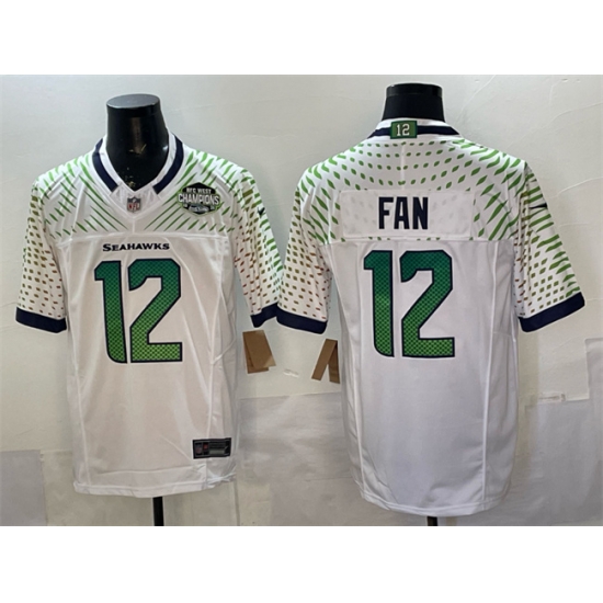 Men Seattle Seahawks 12 Fan White 2025 F U S E Rivalries NFC West Division Champions Patch Vapor Untouchable Limited Stitched Football Jersey