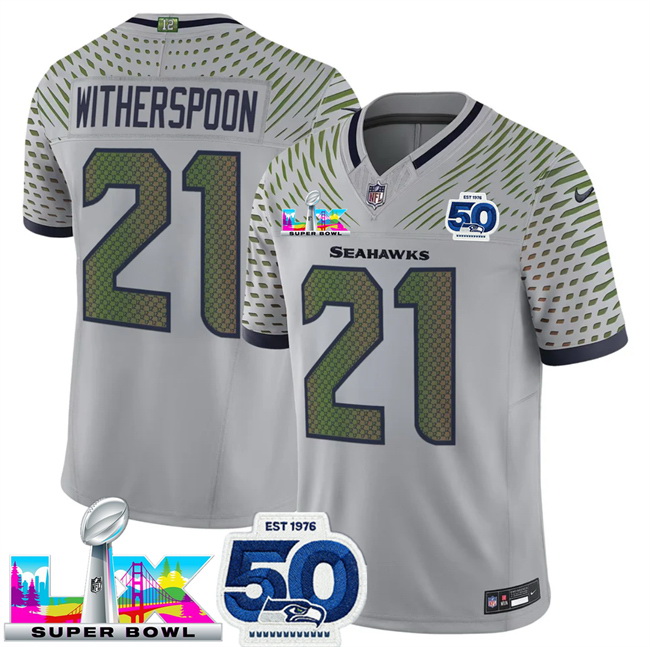 Home>NFL>2025 2026 Super Bowl LX>Seattle Seahawks>Men Seattle Seahawks 21 Devon Witherspoon Royal 2025 F U S E Super Bowl LX Patch And 50th Season Patch Rivalries Vapor Limited Stitched Football Jersey