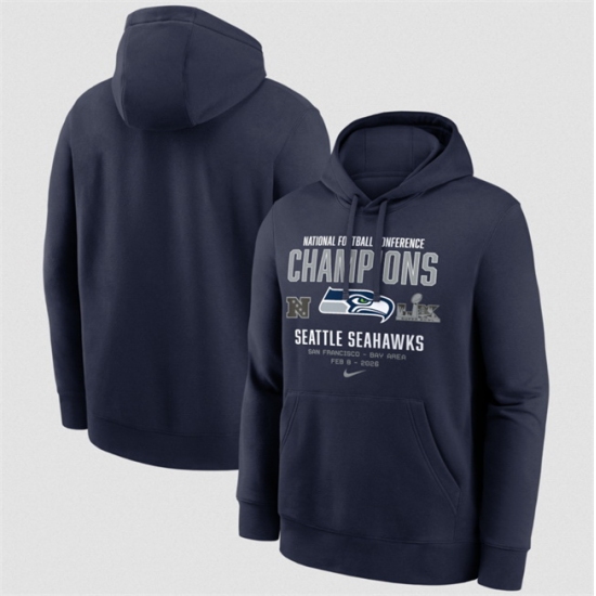 Home>NFL>2025 2026 Super Bowl LX>Super Bowl Hoodie T Shirts>Men Seattle Seahawks College Navy 2025 NFC Champions Team Nation Hoodie