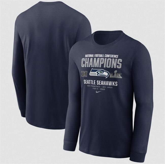 Home>NFL>2025 2026 Super Bowl LX>Super Bowl Hoodie T Shirts>Men Seattle Seahawks College Navy 2025 NFC Champions Team Nation Long Sleeve T Shirt