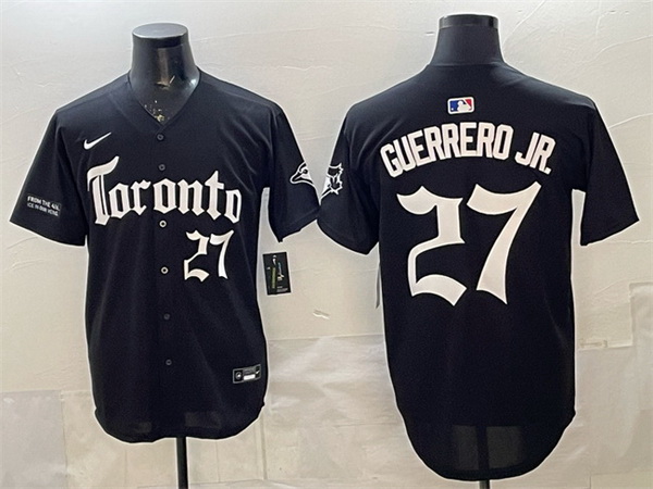 Men Toronto Blue Jays 27 Vladimir Guerrero Jr Black Gothic North Edition Limited Stitched Baseball Jersey