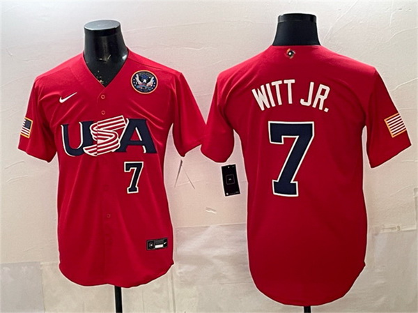 Men USA Baseball 7 Bobby Witt Jr Red 2026 World Baseball Classic United States 250th Anniversary Patch Stadium Stitched Jersey