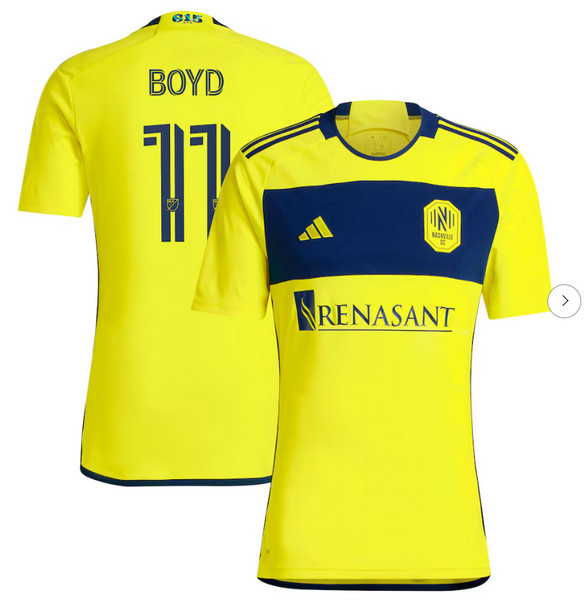 Home>Soccer>MLS Soccer Jerseys>Nashville SC>Mens Nashville SC Tyler Boyd adidas Yellow 2024 The 615 Kit Replica Player Jersey