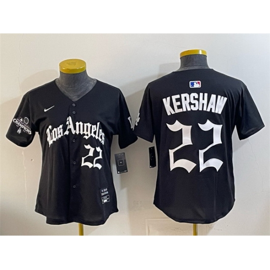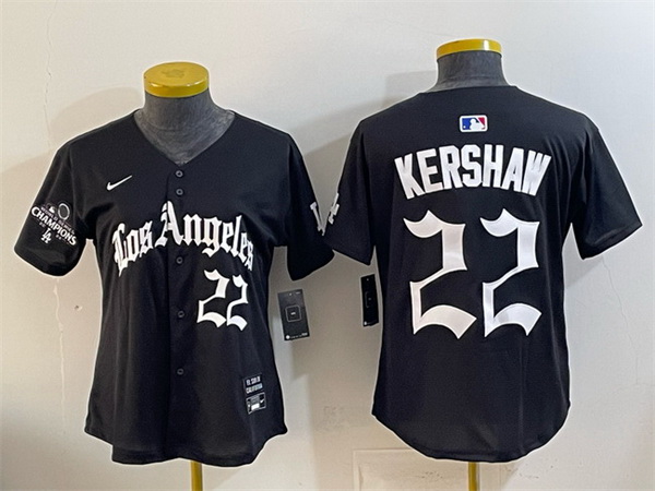 Home>MLB>Los Angeles Dodgers>Women>Women Los Angeles Dodgers 22 Clayton Kershaw Black 2025 World Series Champions LA Gothic Edition Limited Stitched Baseball Jersey