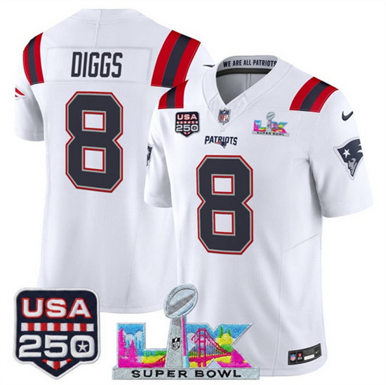 Home>NFL>2025 2026 Super Bowl LX>New England Patriots>Youth New England Patriots 8 Stefon Diggs White 2025 F U S E Super Bowl LX USA 250 Patch Vapor Limited Stitched Football Jersey